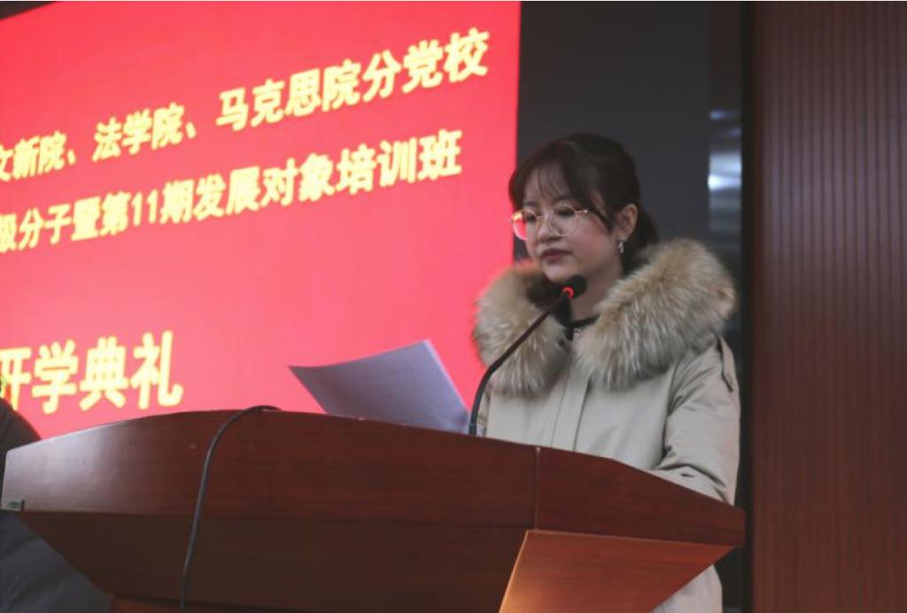 接着,来自广电1801班的发展对象代表项梦婷同学代表本期所有的发展对象进行了发言。在发言中,她首先对一直以来教育、关心他们成长的领导老师和帮助支持他们的支部成员致以感谢,回顾了自己从一个共青团员到今天成为发展对象这一路上的收获与坚持,并以“我们时刻以要成为一名中国共产党员的目标来激励自己不断向前迈进”来总结了自己自提交入党申请书以来的学习生活过程;然后,她谈起自己从小到大一直以来对党的深切向往,特别指出了在此前第一次参与党校学习培训时,党章中的真知灼见对其心灵的洗礼作用;最后,她强调:“组织上入党是一生一次,思想上入党是一生一世”,对自己以及其他所有发展对象在今后的进一步学习提出要求,对与会领导、老师以及各位同学寄予了真诚祝福。