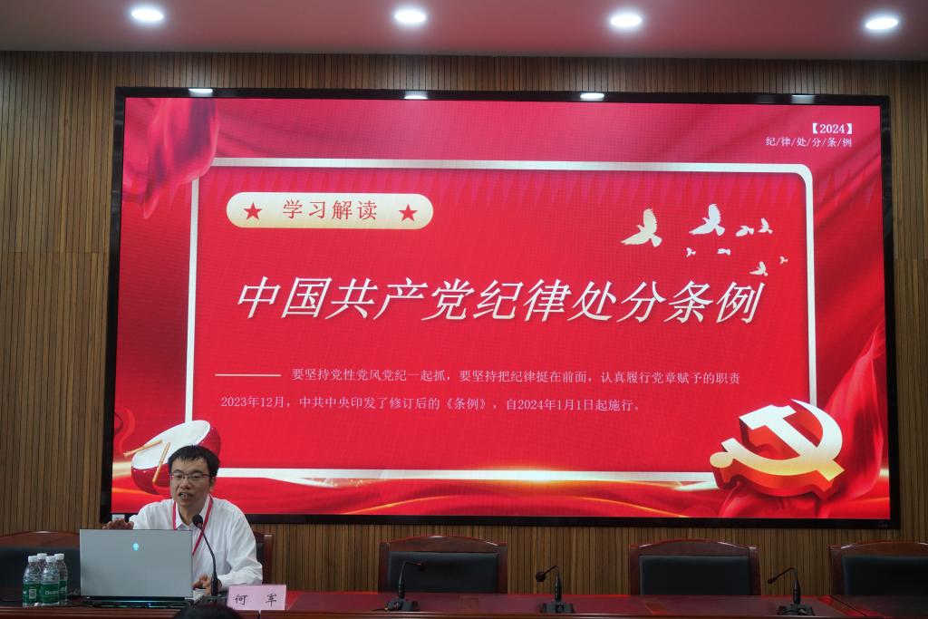 “加强纪律性,革命无不胜。”“中国共产党为什么能跳出治乱兴衰历史周期率?”“经过不懈努力,党找到了自我革命这一跳出治乱兴衰历史周期率的第二个答案。”何军从修订意义、主要亮点、如何践行等方面,对《中国共产党纪律处分条例》展开讲解。何军指出,我们党是靠革命理想和铁的纪律组织起来、凝聚起来的马克思主义政党,纪律严明是党的光荣传统和独特优势,正是以严明的纪律推进党的自我革命,以伟大自我革命引领伟大社会革命,我们党才取得了一个又一个胜利,赢得了全国各族人民的衷心拥护,成为中国特色社会主义事业的坚强领导核心。何军强调,高校学子要认清自己肩上的责任,坚定理想信念,重修养强品德,在校期间就要注重廉洁养成、强化纪律和规矩意识,党员员工更要认真学习《条例》,把增强党性、严守纪律、砥砺作风内化于心,外化于行,为成为堪当民族复兴大任的时代新人奠定坚实基础。