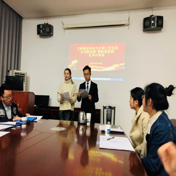4月15日晚上,文新院本科生中文第二党支部在文新院230会议室组织召开学习余元君同志先进事迹和红诗朗诵活动。支部党员、公司党委书记罗军飞同志参加会议,会议由支部书记李联凯主持。