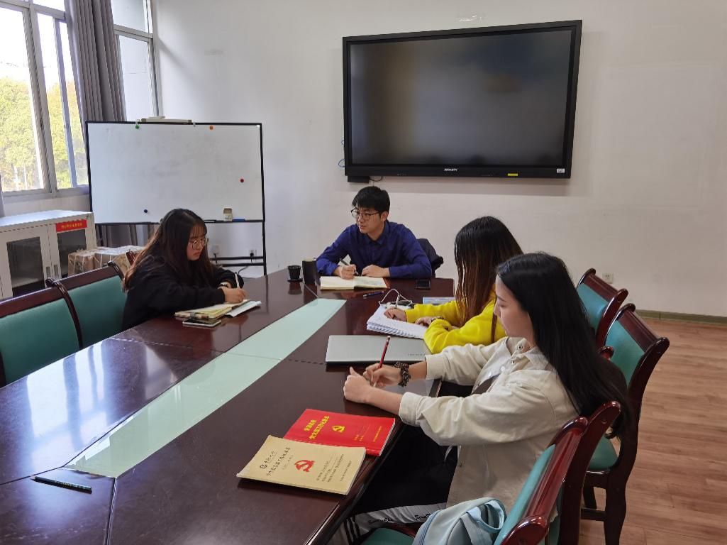 2020年11月9日下午3时,文新院本科生中文党支部于文法楼234会议室召开了学习十九届五中全会精神及十四五规划支委会。支部书记易孝慈同志主持了本次会议,支部副书记宋云飞、组织委员李欣悦、宣传委员王雨墨、纪检委员赵琳琳等同志参与此次会议。