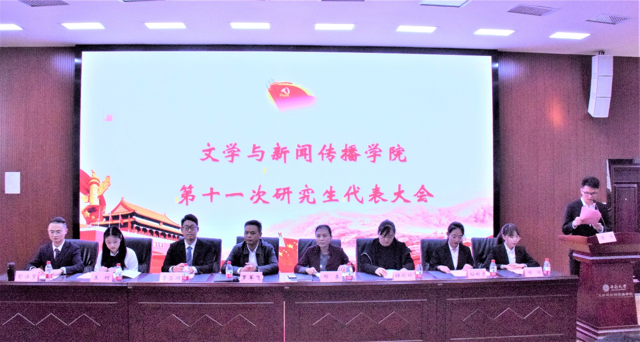 会议在庄严的国歌声中正式拉开序幕。文新院第十届研究生会副主席陈涛主持此次会议,副主席邹丽致开幕词。