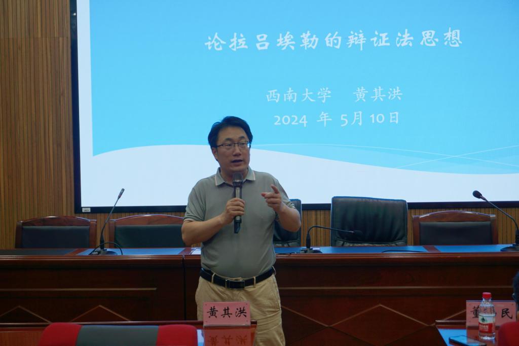 5月10日晚,西南大学教授、英国肯特大学访问学者、西方马克思主义研究所所长黄其洪应邀来到伟德官网,为公司师生带来题为“再议拉吕埃勒的辩证法思想”的精彩而颇具前沿性的学术讲座。哲学系丁瑞莲、刘淘宁、向玉竹、姚勇、杨畅等老师参加了讲座。讲座由公司哲学系副教授董山民主持。