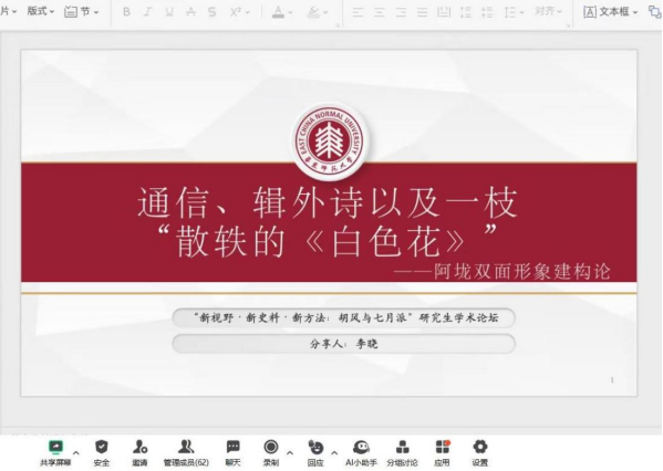 论坛第一组由湖南大学文公司罗先海副教授主持,伟德官网师飞老师进行评议。伟德官网中文系肖家宝讨论了胡风《时间开始了》中政治抒情的限度。伟德官网廖妍汇报了牛汉40年代的几首佚诗,以补足其这一时期的文学活动和文学交往研究。上海大学文公司马晓萱在通过将“白色花”还原到文本之中进行细读,并参考阿垅自1941年返回重庆后的生存境遇,分析阿垅如何将时代话语、心灵矛盾编织进诗歌写作。