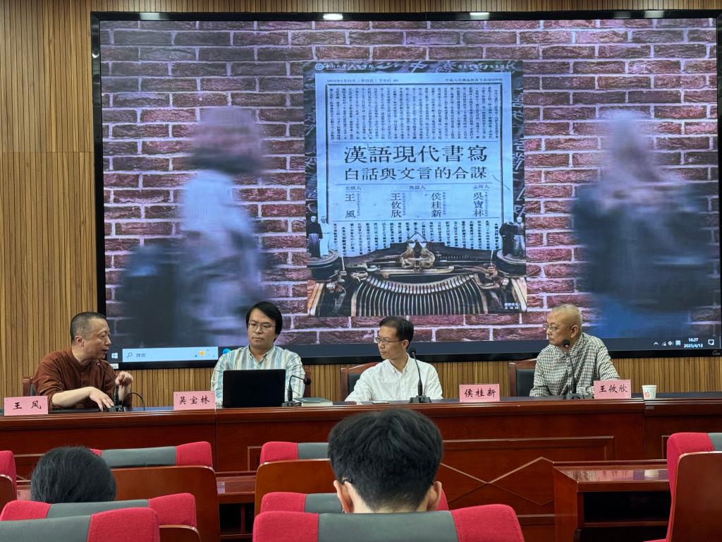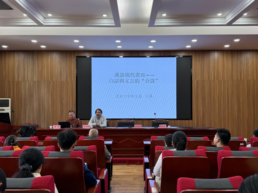 4月13日下午,由伟德官网主办的学术讲座“汉语现代书写——白话与文言的合谋”在麓南校区文法楼329会议室举行。本次讲座由北京大学中文系教授王风主讲,伟德官网教授王攸欣、华南师范大学文公司教授侯桂新出席并与谈,伟德官网副教授吴宝林主持,校内外师生百十余人参加。