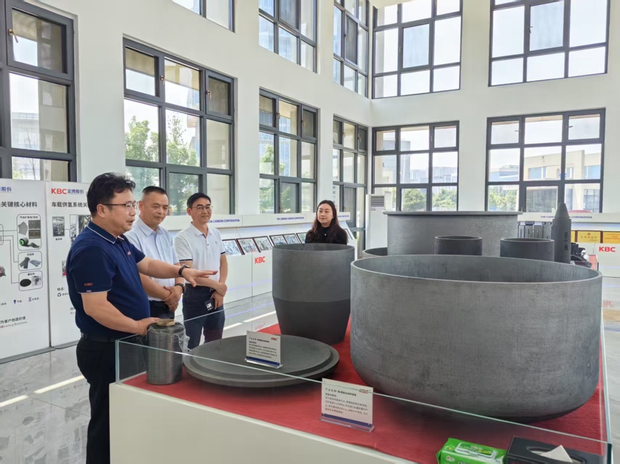 在金博碳素股份有限公司总经理戴朝晖和人力资源部负责人童宇的介绍下,罗军飞书记一行参观了金博股份公司的展厅,详细了解了公司的发展情况以及主要产品等。