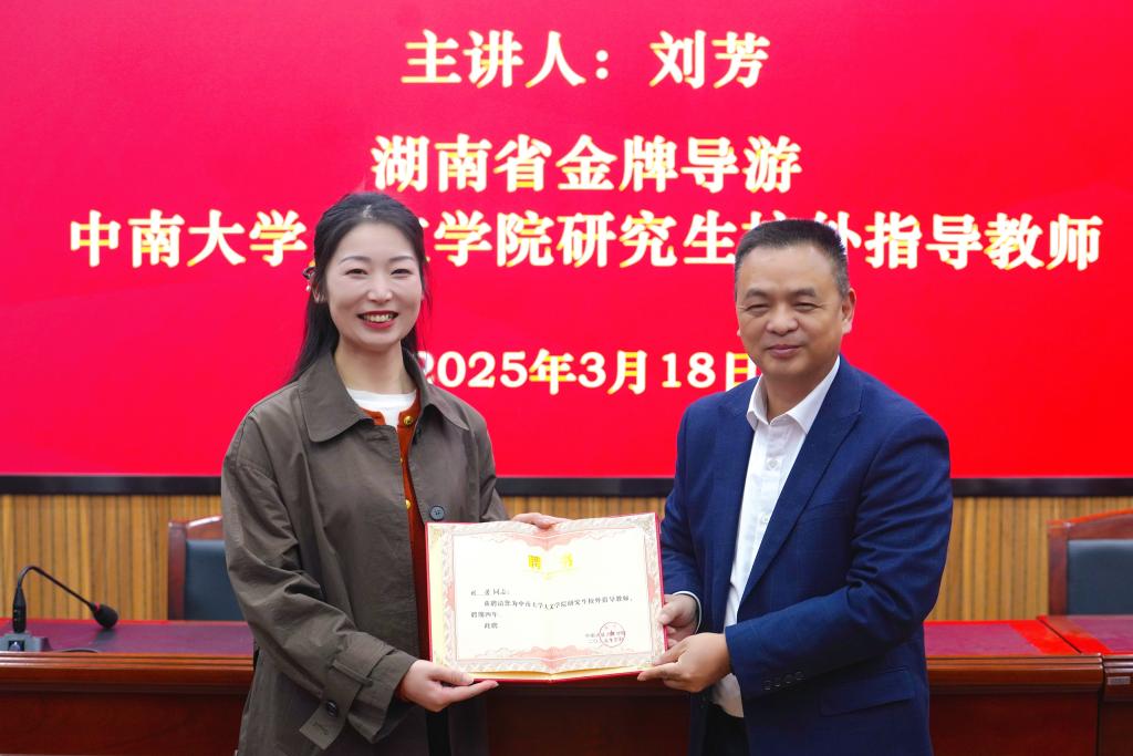 揭牌仪式后,罗军飞为刘芳授予了研究生校外指导教师聘书。在接下来的“文旅短视频实践课程分享”讲座中,刘芳围绕短视频创作的核心要点,分享了制作方法、流量获取规则、IP打造策略及平台用户画像。她强调了“长期主义”的重要性,鼓励同学们将所学知识转化为高质量内容,持续深耕,打造有影响力的文旅短视频作品。结合湖湘文化传播的成功案例,她分析了文旅内容的核心价值,并探讨了如何捕捉“爆点”进行有效传播。讲座尾声,刘芳详细解答了同学们关于创作、流量测试和变现等问题,帮助大家更清晰地了解短视频创作的全流程。讲座内容充实,现场互动热烈,收获颇丰。