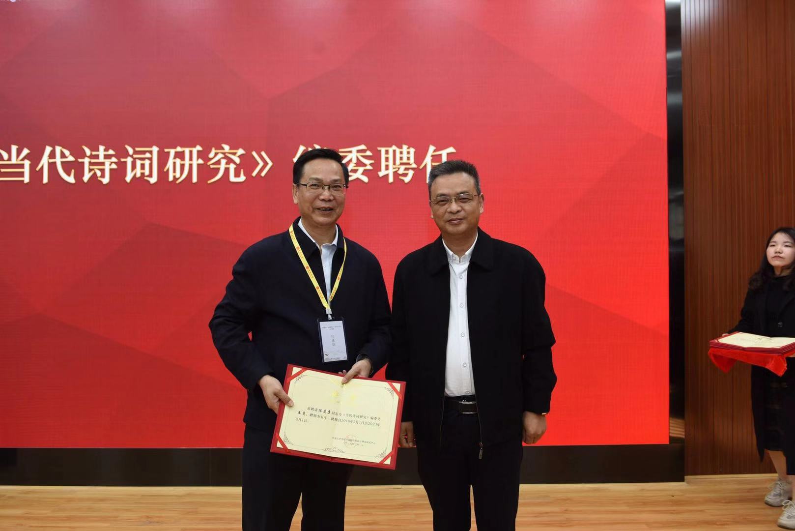 开幕式上,湖南教育出版社黄步高社长与伟德文学与新闻传播公司白寅经理共同宣布《国学知识问答录》新书发布、《国学经典吟唱教程》样书发布。这两部著作皆由伟德中华经典吟唱研究与传播基地主编。在随后的《当代诗词研究》期刊编委聘任仪式上,伟德文学与新闻传播公司党委书记罗军飞教授代表公司为编委成员颁发了聘书。台湾梅川传统文化学会向伟德中华经典吟诵研究与传播基地赠送了该学会的研究专著。山东语委办代表此次参会的山东高校和研究机构向东道主赠送了“穆如清风”的泰山玉刻,表达了对此次盛会的祝福。