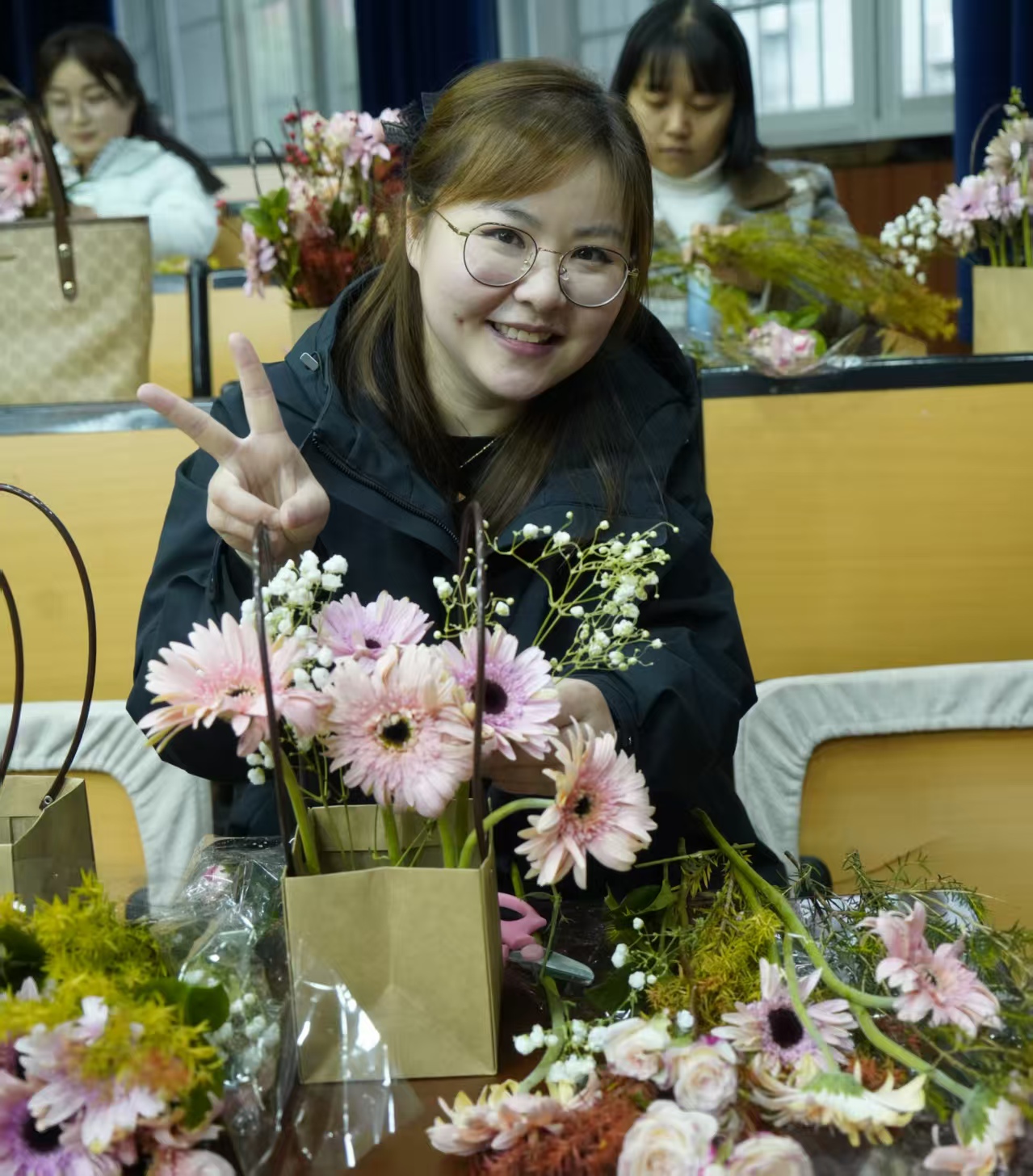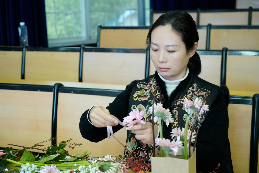 经过一个多小时的精心制作,一篮篮独具匠心、错落有致的插花作品逐渐成型,大家纷纷展示自己的作品并拍照留念。