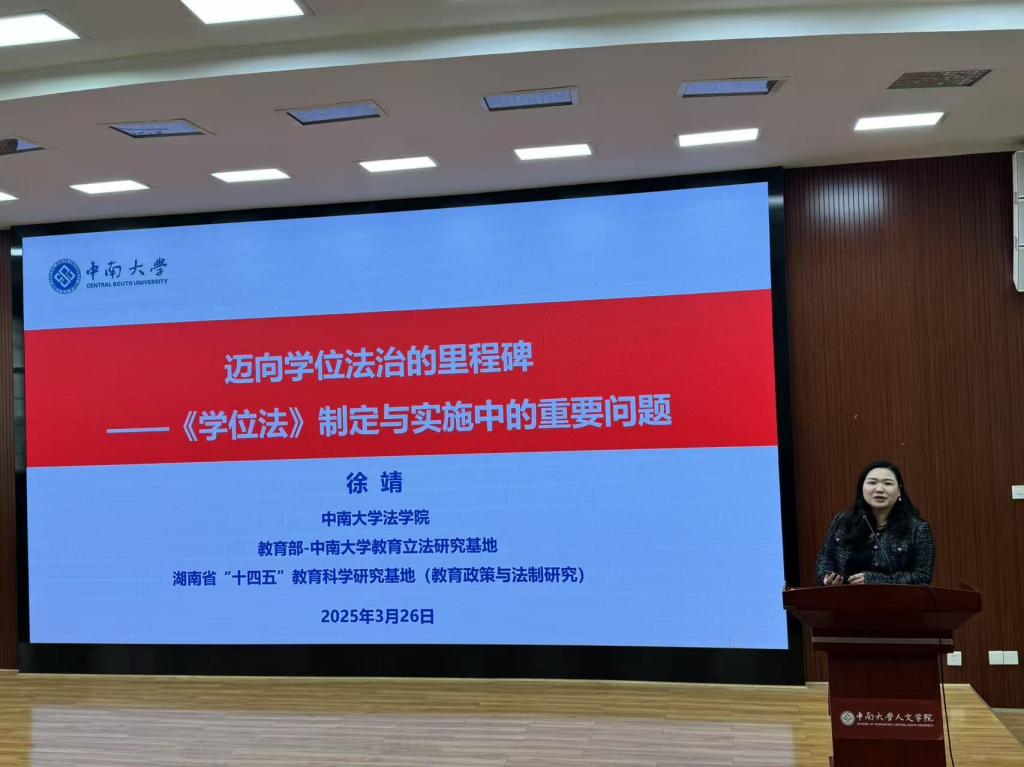 法公司徐婧教授主讲了《中华人民共和国学位法》出台的意义与要求。她强调,《学位法》的修订将成熟的制度经验做法写进国家立法,充分体现学位立法的严谨性、开放性和包容性,并从学位授予标准、学位授予程序中的答辩委员会与学位评定委员会、学术复核与学位复核、学术不端全过程管理这四个方面进行了深刻的分析。