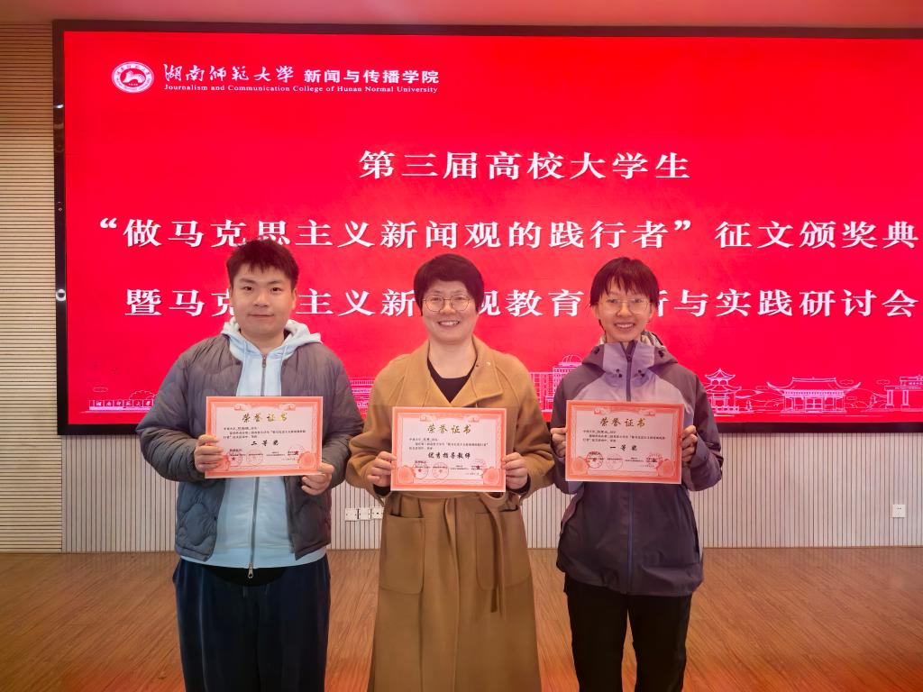 公司师生在本届活动中表现突出,成果显著,凌菁副教授带队参加了颁奖典礼。在奖项方面,冯可儿同学的征文《范长江西北通讯话语建构与共产党形象重塑——基于马新观报道实践与革命主体性彰显》(指导教师:田常清)荣获一等奖;戴思卿、刘芷菲、刘宗坤、马柯歆、王晗悦、袁嘉旎六位同学荣获征文二等奖。同时,冯杰、凌菁、罗军飞、欧阳云玲、田常清等多位教师获评“优秀指导教师奖”。